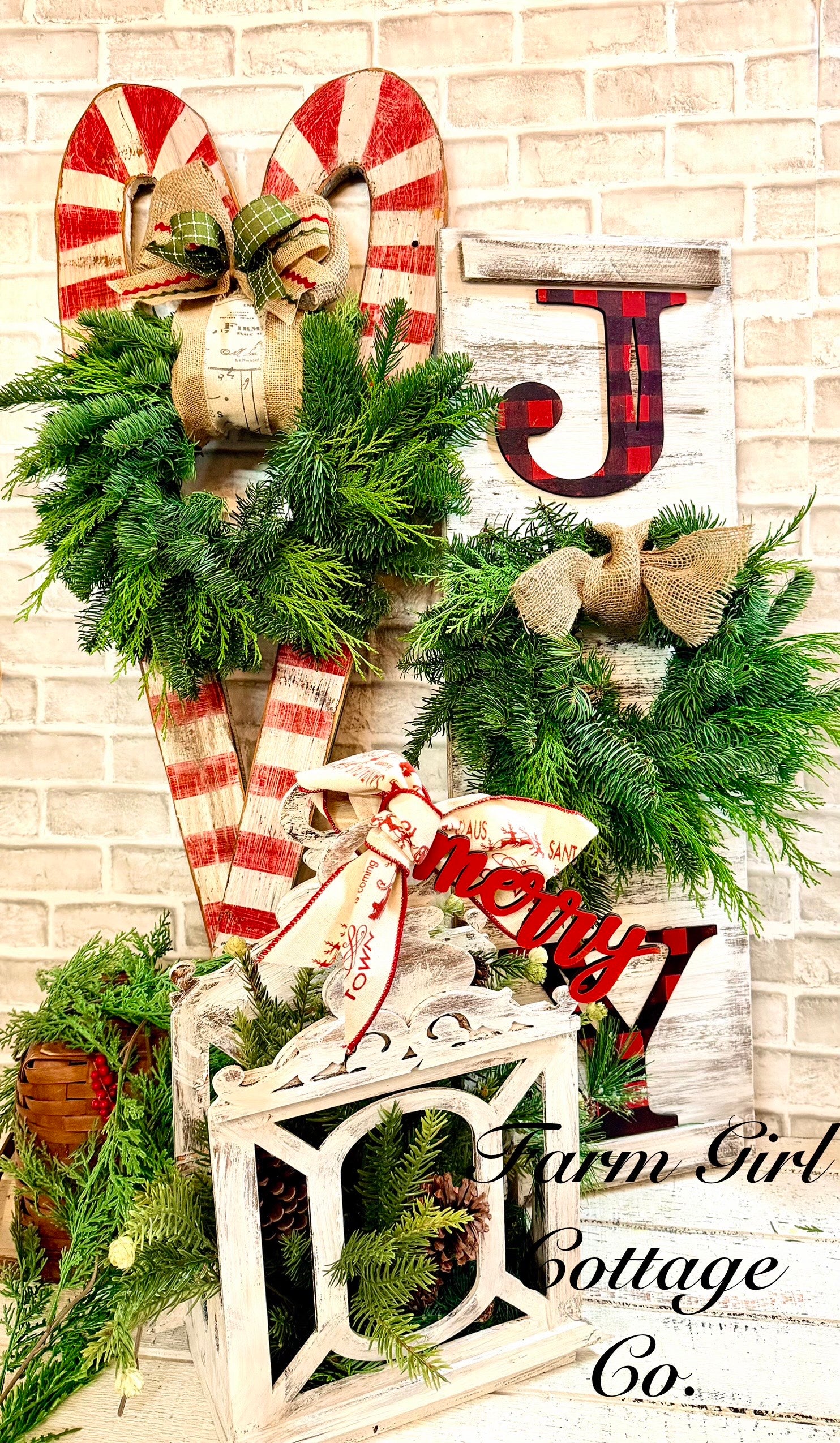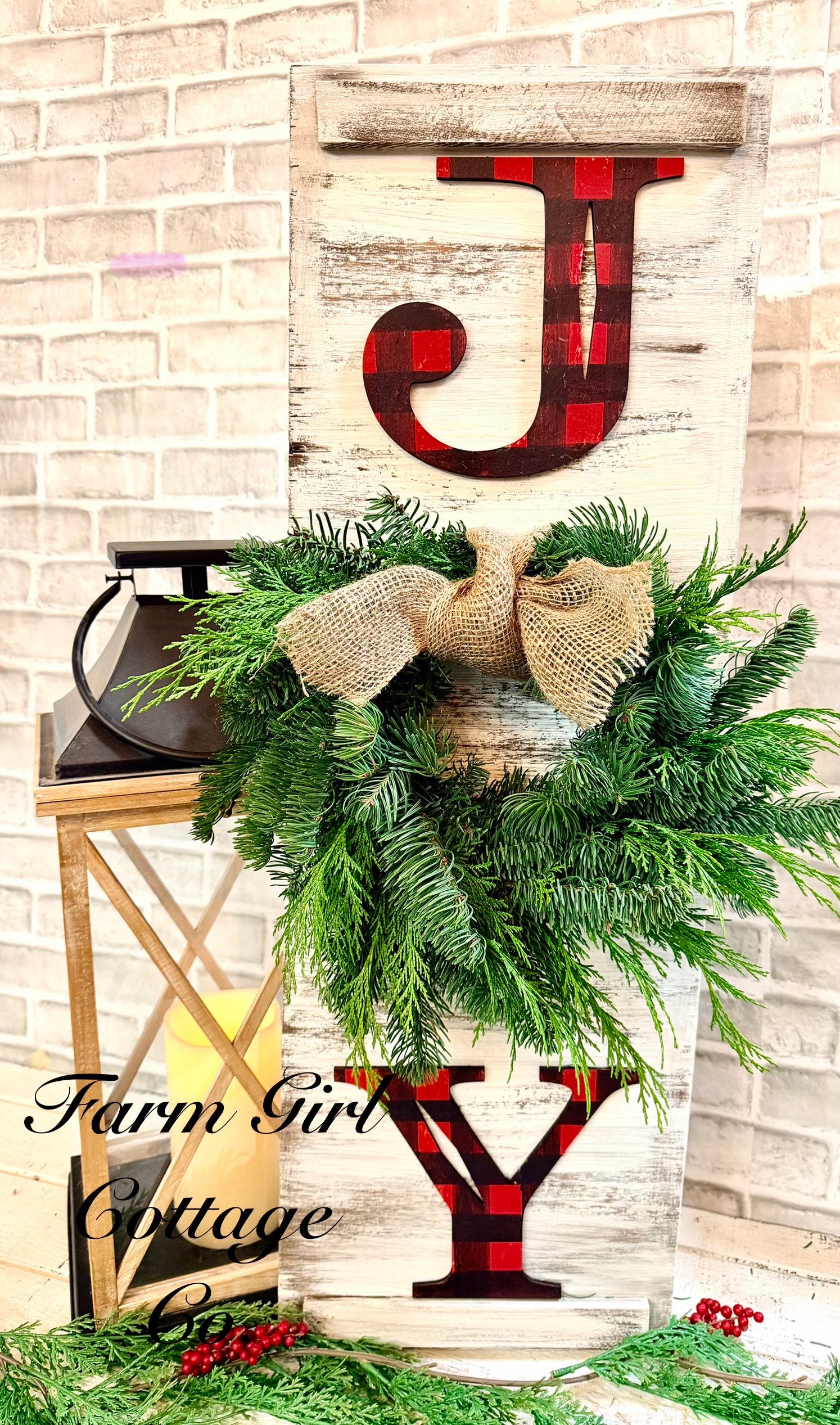 JOY SIGN- 12'' WIDE X 36'' TALL THIS WILL COME STAINED AND YOU CAN DECIDE TO MAKE IT DARKER OR USE A PAINT OVER IT. PICK YOUR COLORS FOR THE J AND Y- I WILL ALSO TEACH YOU HOW TO CREATE BUFFALO PLAID. COORDINATE WITH A FRESH WREATH YOU WILL MAKE AND PRETTY RIBBONS.